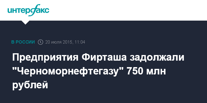 Москва. 20 июля. INTERFAX.RU - Компании "Крымский титан" и "Крымский содовый завод", принадлежащие крупному украинскому бизнесмену Дмитрию Фирташу, задолжали крымскому государственному предприятию "Черноморнефтегаз" около 750 млн рублей за потребленный газ, сообщил генеральный директор "Черноморнефтегаза" Сергей Бейм.