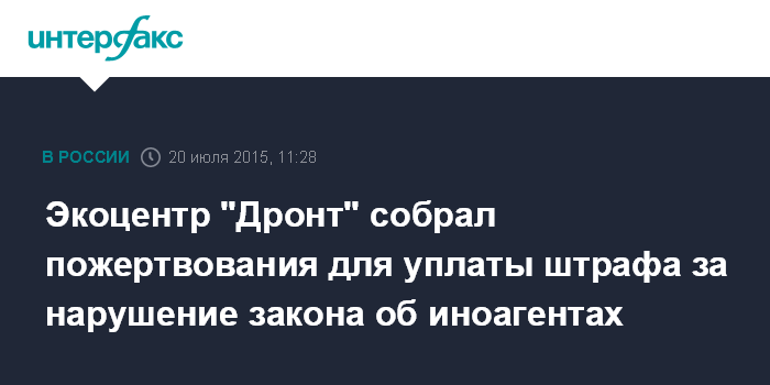 Москва. 20 июля. INTERFAX.RU - Межрегиональная общественная организация "Экологический центр "Дронт" за три недели смогла собрать необходимую сумму для уплаты штрафа в 300 тысяч рублей, наложенного на нее за неисполнение обязанностей НКО-"иностранного агента", сообщил руководитель организации Асхат Каюмов агентству "Интерфакс" в понедельник.