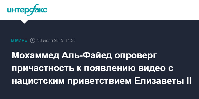 Москва. 20 июля. INTERFAX.RU - Представитель египетского предпринимателя Мохаммеда Аль-Файеда опроверг слухи о том, что бывший владелец лондонского универмага Harrods причастен к обнародованию кадров 1933 года, на которых будущая королева Великобритании Елизавета II, предположительно, вскидывает руку в нацистском приветствии/