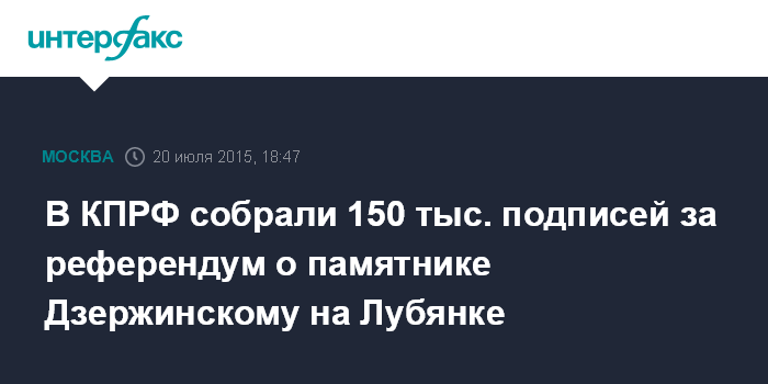 Москва. 20 июля. INTERFAX.RU - КПРФ собрала более 150 тыс. подписей для того, чтобы инициировать референдум о возвращении памятника Феликсу Дзержинскому на Лубянку, сообщил зампред ЦК компартии, депутат Госдумы Валерий Рашкин.