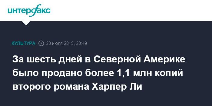 За шесть дней в Северной Америке было продано более 1,1 млн копий второго романа Харпер Ли