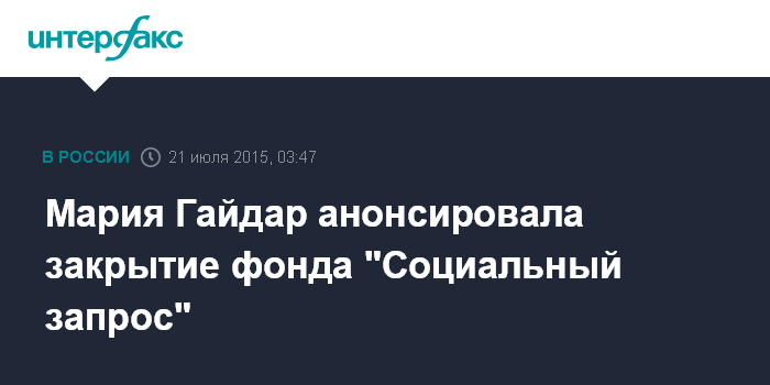 Москва. 21 июля. INTERFAX.RU - Фонд "Социальный запрос", который ранее возглавляла Мария Гайдар, может прекратить свое существование после завершения проекта "Центр юридического волонтерства", на который он в 2014 году получил президентский грант в 2,1 млн рублей, сообщает "Коммерсант" во вторник.