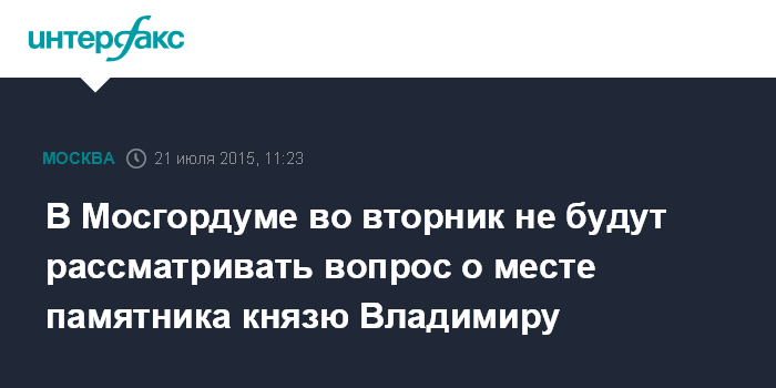 Москва. 21 июля. INTERFAX.RU - Комиссия по монументальному искусству при Мосгордуме не будет рассматривать вопрос об изменении места будущей установки памятника князю Владимиру - Святителю Руси.