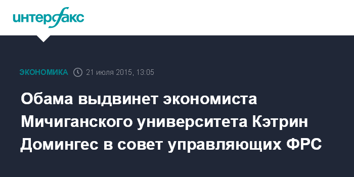 Москва. 21 июля. INTERFAX.RU – Президент США Барак Обама планирует номинировать экономиста Мичиганского университета Кэтрин Домингес на место в совете управляющих Федеральной резервной системы, говорится в сообщении Белого дома.