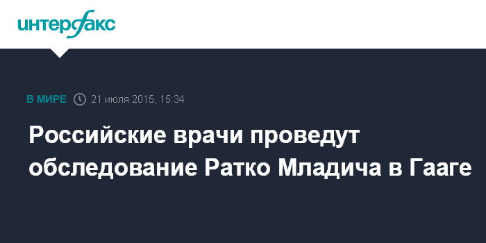 Москва. 21 июля. INTERFAX.RU - Группа врачей из России отправилась в Гаагу, где проведет обследование бывшего командующего войсками боснийских сербов Ратко Младича, находящегося в тюрьме Международного суда по бывшей Югославии (МТБЮ).