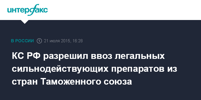 Москва. 21 июля. INTERFAX.RU - Конституционный суд РФ подтвердил право ввоза на территорию РФ сильнодействующих препаратов из стран Таможенного союза при соблюдении общих правил обращения лекарственных средств.