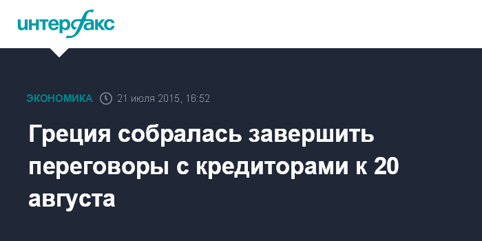 Москва. 21 июля. INTERFAX.RU – Греция рассчитывает завершить переговоры с кредиторами об условиях очередной программы помощи к 20 августа, сообщает MarketWatch со ссылкой на источник Reuters в правительстве Греции.