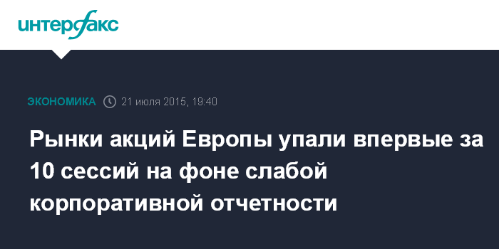 Москва. 21 июля. INTERFAX.RU - Фондовые индексы Западной Европы завершили в минусе торги во вторник, снизившись впервые за 10 сессий, на фоне слабой отчетности ряда крупных компаний за минувший квартал, сообщает агентство Bloomberg.