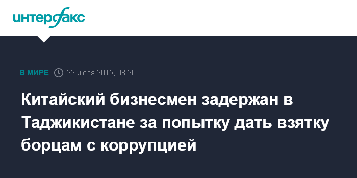 Москва. 22 июля. INTERFAX.RU - В Таджикистане задержан глава предприятия по переплавке металла, гражданин Китая, подозреваемый в попытке дачи должностному лицу взятки в размере 3 млн сомони (около $479 тысяч), сообщила в среду пресс-служба Агентства по госфинконтролю и борьбе с коррупцией при президенте республики.