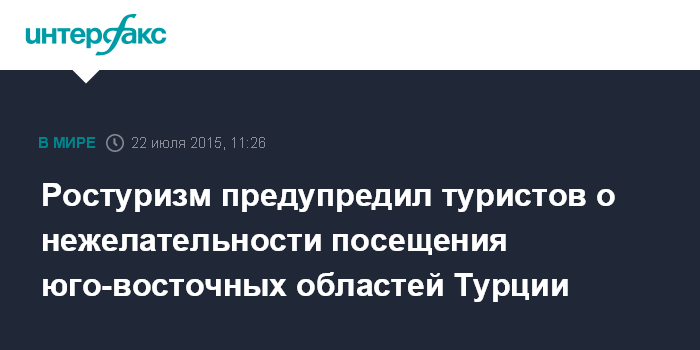 Москва. 22 июля. INTERFAX.RU - Ростуризм рекомендует россиянам не посещать юго-восточные провинции Турции, граничащие с Сирией, сообщается в среду на сайте ведомства.