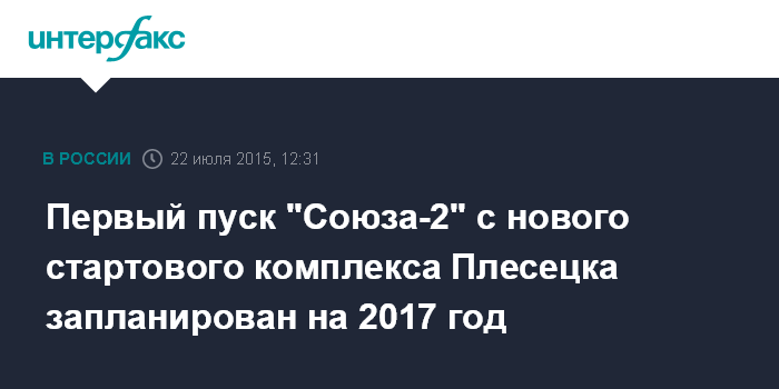 Москва. 22 июля. INTERFAX.RU - Первый испытательный пуск ракеты-носителя среднего класса "Союз-2" с нового стартового комплекса космодрома Плесецк планируется провести в первой половине 2017 года. Об этом сообщил командующий Войсками воздушно-космической обороны генерал-лейтенант Александр Головко.