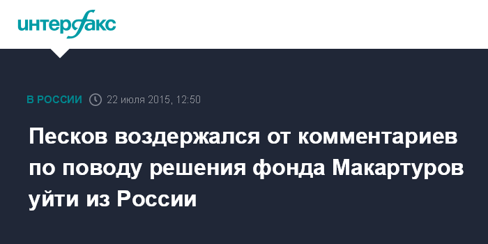 Москва. 22 июля. INTERFAX.RU - В Кремле не комментируют решение американского фонда Макартуров прекратить свою деятельность на территории России из-за попадания "патриотический стоп-лист" Совета Федерации РФ, равно как и само создание перечня нежелательных организаций.