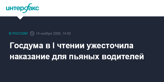 Москва. 14 ноября. INTERFAX.RU - Депутаты Государственной думы РФ в пятницу приняли в первом чтении правительственный законопроект, направленный на усиление уголовной ответственности за нарушение Правил дорожного движения (ПДД) водителями, находящимися в состоянии алкогольного или наркотического опьянения. Соответствующие изменения предложено внести в ст.264 УК РФ.