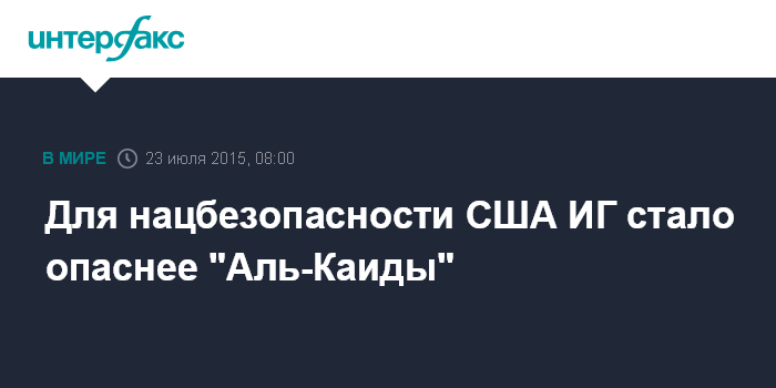 Москва. 23 июля. INTERFAX.RU - В настоящее время угроза национальной безопасности Соединенных Штатов, исходящая от "Исламского государства" (ИГ), превосходит угрозу от действий Аль-Каиды", считает директор ФБР Джеймс Коми.