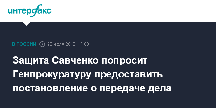 Москва. 23 июля. INTERFAX.RU - Адвокат украинки Надежды Савченко, обвиняемой в убийстве российских журналистов, намерен добиться от Генеральной прокуратуры постановления о передаче ее дела в Ростовскую область, чтобы обжаловать действия надзорного органа в суде.