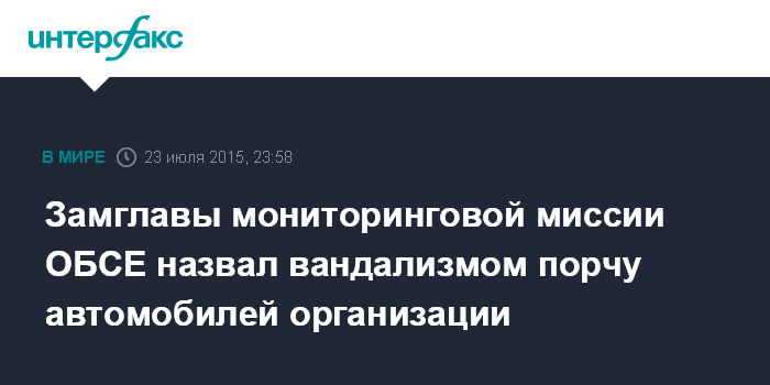 Москва. 23 июля. INTERFAX.RU - Заместитель главы Специальной мониторинговой миссии ОБСЕ на Украине Александр Хуг заявил, что порча в четверг автомобилей ОБСЕ с использованием краски у гостиницы в Донецке была не акцией протеста, а спланированным актом вандализма.