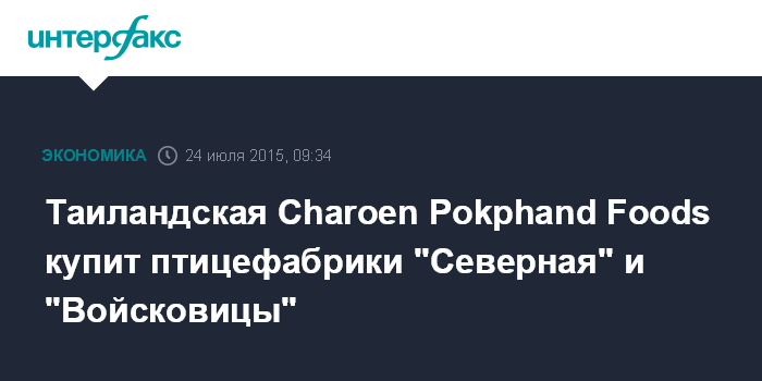 Москва. 24 июля. INTERFAX.RU – Таиландская компания Charoen Pokphand Foods (CPF) покупает через свою голландскую "дочку" крупные птицефабрики под Петербургом - "Северная" и "Войсковицы", общая стоимость сделки, которая пройдет в два этапа, составит 680 млн евро.