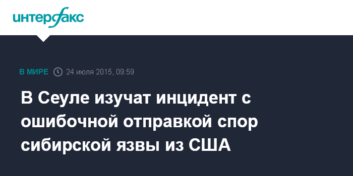 Москва. 24 июля. INTERFAX.RU - Власти Южной Кореи планируют тщательно изучить инцидент с ошибочной отправкой Пентагоном в страну живых спор сибирской язвы, передает в пятницу агентство EFE.