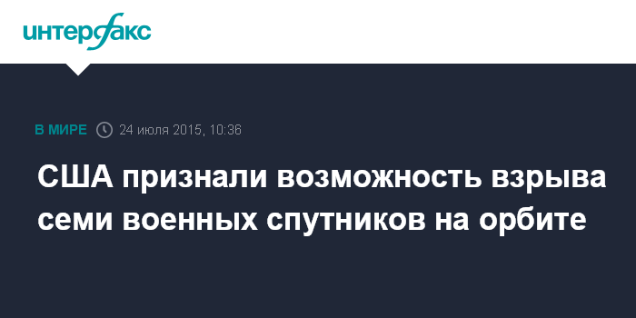 Москва. 24 июля. INTERFAX.RU - Американские военные не исключают возможности разрушения семи метеоспутников однотипных с космическим аппаратом DMSP-F13, взорвавшимся 3 февраля 2015 года, сообщает специализированный сайт со ссылкой на коммюнике 50-го Космического крыла Военно-воздушных сил США.