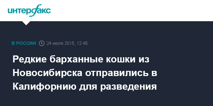 Москва. 24 июля. INTERFAX.RU - Новосибирский зоопарк отправил четырех барханных котов в американский центр разведения экзотических кошек, который находится в калифорнийском городке Розамонд, сообщается на сайте зверница.