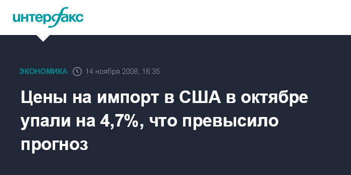 Нью-Йорк. 14 ноября. INTERFAX.RU - Цены на импорт в США в октябре упали на 4,7%, сообщило агентство Bloomberg со ссылкой на данные министерства труда.
