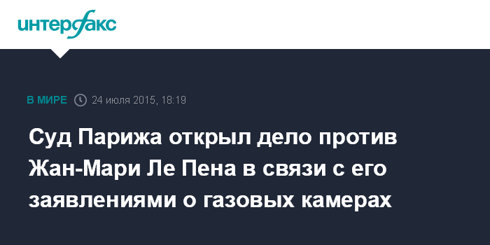 Москва. 24 июля. INTERFAX.RU - Основатель партии "Национальный фронт" Жан-Мари Ле Пен предстанет перед судом после высказывания о том, что газовые камеры времен Второй мировой войны являются "лишь деталью", сообщают в пятницу французские СМИ.