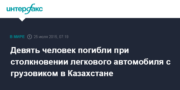 Москва. 25 июля. INTERFAX.RU - В Алматинской области Казахстана в результате столкновения легкового автомобиля с грузовиком погибли девять человек, трое госпитализированы, сообщила пресс-служба областной полиции.