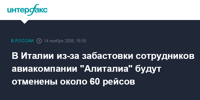 Москва. 14 ноября. INTERFAX.RU - Около 60 рейсов авиакомпании "Алиталиа" будут отменены в пятницу в римском аэропорту "Фьюмичино", сообщают работники аэропорта.