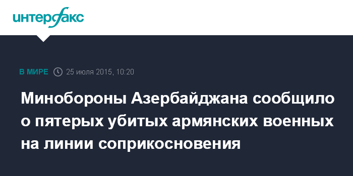 Москва. 25 июля. INTERFAX.RU - Вооруженные силы Азербайджана отбили атаку армянских военных в зоне карабахского конфликта, ликвидированы пять армянских военных, сообщает в субботу пресс-служба азербайджанского министерства обороны.