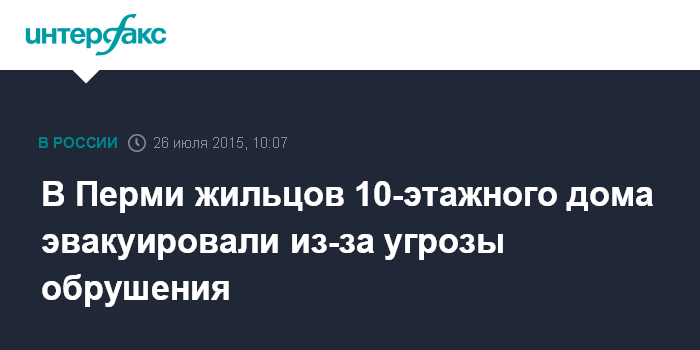 Москва. 26 июля. INTERFAX.RU - Власти Перми вечером в субботу приняли решение об эвакуации жителей 10-этажного дома по улице Беляева, 43 из-за угрозы обрушения, сообщил в одной из соцсетей мэр города Игорь Сапко.