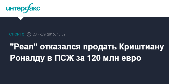 Москва. 26 июля. INTERFAX.RU - Французский футбольный клуб "Пари Сен-Жермен" предложил мадридскому "Реалу" 120 млн евро за 30-летнего португальского нападающего Криштиану Роналду, однако "Реал" не согласился на эту сделку, сообщает AS.