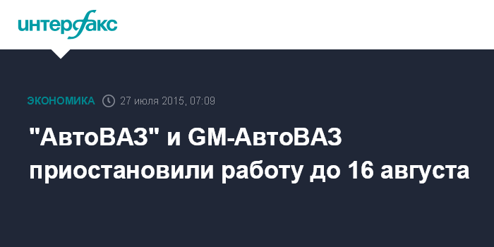 Москва. 27 июля. INTERFAX.RU - ОАО "АвтоВАЗ" "GM-АвтоВАЗ"(совместное предприятие General Motors и ОАО "АвтоВАЗ) отправили сотрудников в корпоративный отпуск, который продлится с 27 июля по 16 августа, сообщили "Интерфаксу" в пресс-службах компаний.