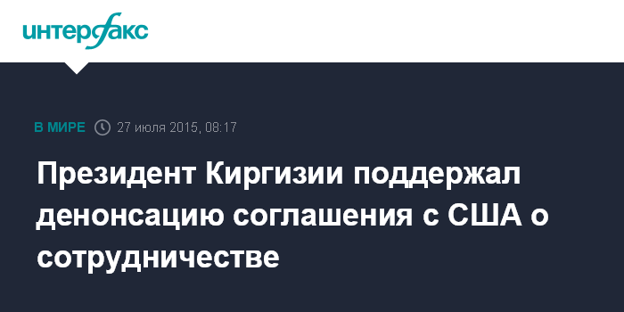 Москва. 27 июля. INTERFAX.RU - Президент Киргизии Алмазбек Атамбаев заявил, что поддерживает решение правительства республики о денонсации соглашения с США о содействии сотрудничеству.