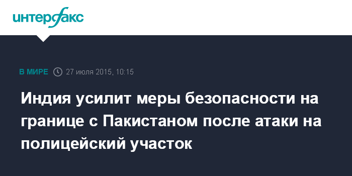 Москва. 27 июля. INTERFAX.RU - Министр внутренних дел Индии Раджнатх Сингх отдал распоряжение усилить контроль на границе с Пакистаном после атаки на полицейский участок в штате Пенджаб, в ходе которой погибли не менее восьми человек, сообщают в понедельник западные СМИ.