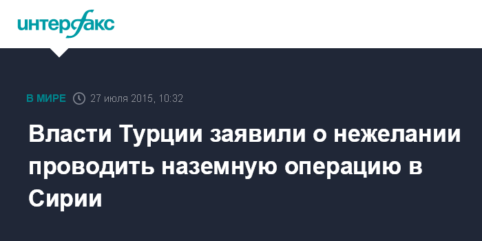 Москва. 27 июля. INTERFAX.RU - Турция не собирается вести в Сирии наземную военную операцию, сообщает "Би-би-си" со ссылкой на премьер-министра страны Ахмета Давутоглу.