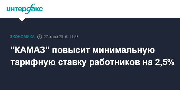 Москва. 27 июля. INTERFAX.RU – Руководство "КАМАЗа" с 1 сентября повышает минимальную тарифную ставку работников во всех подразделениях и организациях компании на 2,5%, с 5 тыс. 970 до 6 тыс. 120 рублей, говорится в сообщении пресс-службы АО.