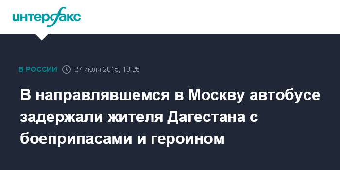 Москва. 27 июля. INTERFAX.RU - Боеприпасы и наркотики изъяты у жителя Дагестана, ехавшего в автобусе в Москву, сообщает пресс-служба ГУ МВД по Северо-Кавказскому федеральному округу.