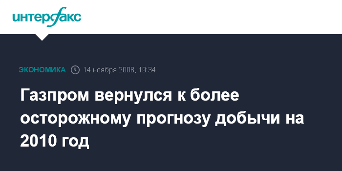 Москва. 14 ноября. NTERFAX.RU - "Газпром" в опубликованном в пятницу квартальном отчете вернулся к более осторожному прогнозу добычи на 2010 год. Верхняя планка прогноза 570 млрд кубометров осталась прежней, однако в новом отчете приводится также и нижняя планка прогноза - 565 млрд кубометров. Отчет за II квартал 2008 г. не содержал нижней планки прогноза.