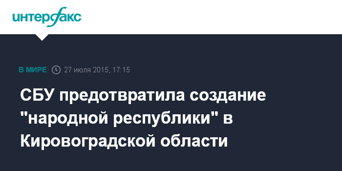 Москва. 27 июля. INTERFAX.RU - Служба безопасности Украины (СБУ) пресекла деятельность группы, члены которой пытались создать в регионе Кировоградскую народную республику, сообщает пресс-служба СБУ в понедельник.