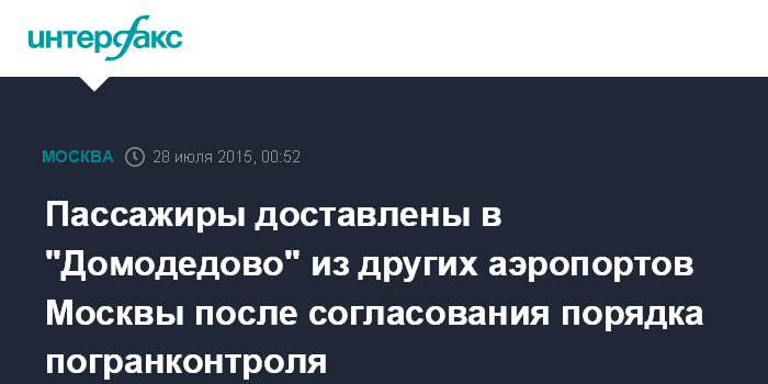 Москва. 28 июля. INTERFAX.RU - Пассажиры рейсов, направленных в "Домодедово" из других аэропортов Москвы, доставлены в терминал аэропорта после согласования порядка прохождения погранконтроля, сообщили "Интерфаксу" в понедельник в пресс-службе аэропорта "Домодедово".