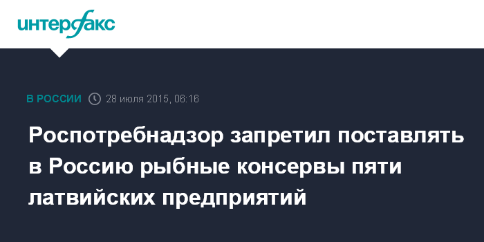 "Федеральная служба по надзору в сфере защиты прав потребителей и благополучия человека сообщает, что при осуществлении государственного надзора за оборотом пищевой продукции при неоднократных исследованиях рыбной консервированной продукции, произведенной на латвийских предприятиях: АО "Вентспилский рыбоконсервный комбинат", ООО "ГАММА-А", ООО "Sabiedrba IMS", ООО "УНДА", ООО "Suldusgalaskombinats" выявлены нарушения требований законодательства в области защиты прав потребителей (несоответствие требований, предъявляемых к маркировке, несоответствие по массовой доле основного продукта, несоответствие по массовой доле составных частей основного продукта, несоответствие по показателю энергетическая ценность и органолептическим показателям). Партии пищевой продукции, не соответствующие установленным требованиям, сняты с реализации. Учитывая изложенное, с 01.08.2015 приостанавливается ввоз на территорию Российской Федерации рыбных консервов указанных латвийских производителей", - говорится в сообщении.