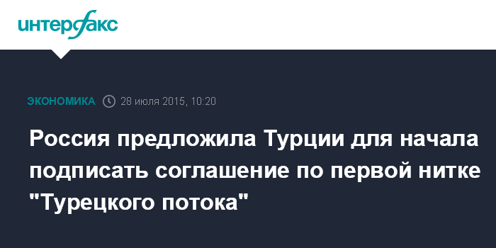 Москва. 28 июля. INTERFAX.RU – Россия предлагает Турции для начала подписать соглашение о строительстве не всех четырех, а первой нитки "Турецкого потока", сообщил журналистам источник в Минэнерго России. По его словам, проект соответствующего межправительственного соглашения был направлен турецкой стороне несколько недель назад.