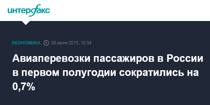 Москва. 28 июля. INTERFAX.RU – Авиационные перевозки пассажиров в России в первом полугодии текущего года сократились на 0,7% по сравнению с тем же периодом 2014 года, примерно до 41,2 млн человек, следует из материалов Росавиации.