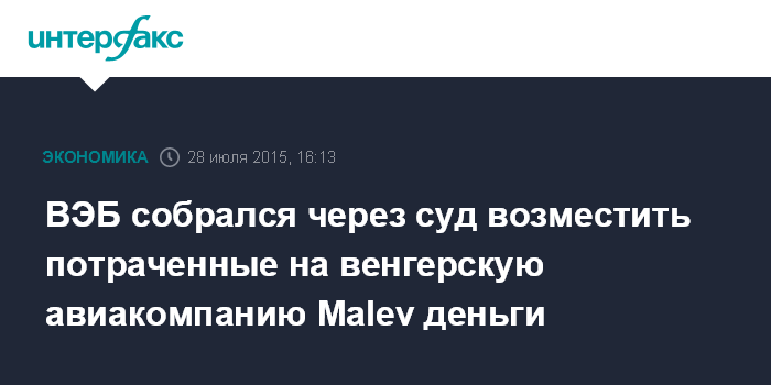 Москва. 28 июля. INTERFAX.RU – Внешэкономбанк планирует через суд взыскать задолженность венгерской авиакомпании Malev, которая прекратила работу в 2012 году.
