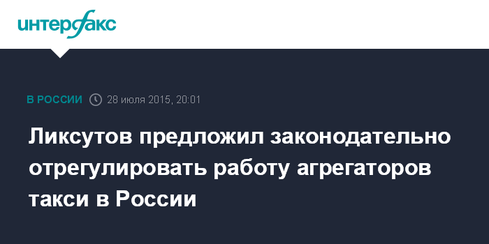 Москва. 28 июля. INTERFAX.RU - Общественная палата и департамент транспорта Москвы направят в Минтранс предложение отрегулировать деятельность агрегаторов такси, сообщил руководитель столичного департамента транспорта и развития дорожно-транспортной инфраструктуры Максим Ликсутов.