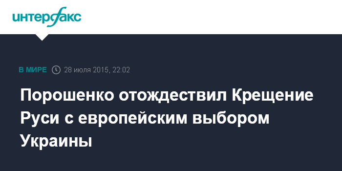 Москва. 28 июля. INTERFAX.RU - Президент Украины Петр Порошенко отождествляет Крещение Руси с европейским выбором украинского народа.