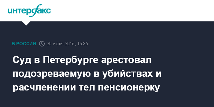 Москва. 29 июля. INTERFAX.RU - Фрунзенский районный суд Петербурга заключил под стражу подозреваемую в убийстве 68-летнюю пенсионерку, передал корреспондент "Интерфакса".
