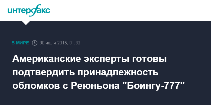 Москва. 30 июля. INTERFAX.RU - Группа экспертов из США считает, что обнаруженные в среду на французском острове Реюньон в Индийском океане фрагменты крыла с высокой долей вероятности принадлежат "Боингу-777", сообщило агентство Associated Press.