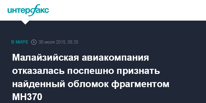 "Малайзийские авиалинии тесно работают совместно с соответствующими властями, что подтвердить (принадлежность обломка - ИФ). К настоящему моменту для авиакомпании было бы слишком преждевременно распространяться о флапероне", - говорится в распространенном компанией заявлении.