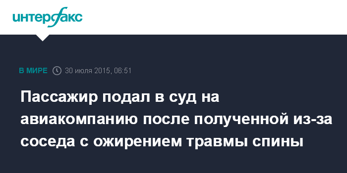 Москва. 30 июля. INTERFAX.RU - Пассажир авиакомпании Etihad Джеймс Андрес Бассос подал на нее в суд, так как получил травму спины, сообщила в четверг газета The Guardian.